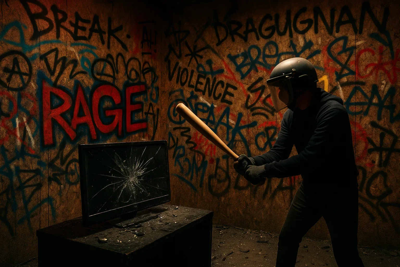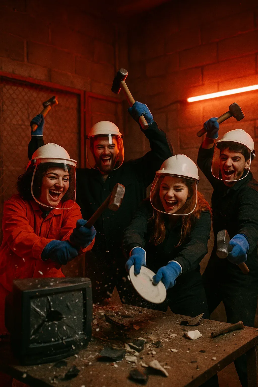 Notre rage room – aussi appelée salle de défoulement est pensée pour toutes les envies : en solo, en duo ou en groupe (jusqu’à quatre personnes). Vous choisissez la durée, les objets à détruire, la musique électro ou le silence, et on s’occupe du reste : équipement de sécurité, encadrement et ambiance immersive. C’est une expérience libératrice et personnalisée, idéale pour un anniversaire, une surprise ou un team building d’entreprise.
